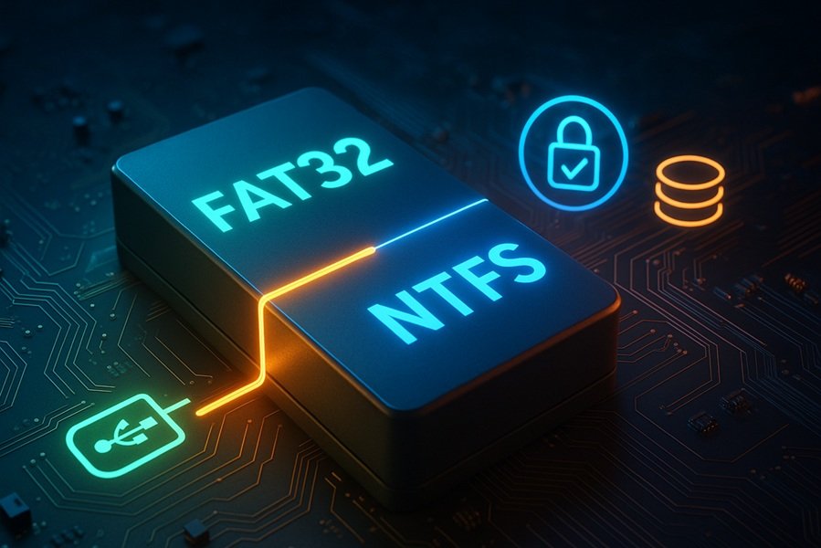 FAT32, though highly compatible, cannot handle files larger than 4 GB or partitions beyond 2 TB.