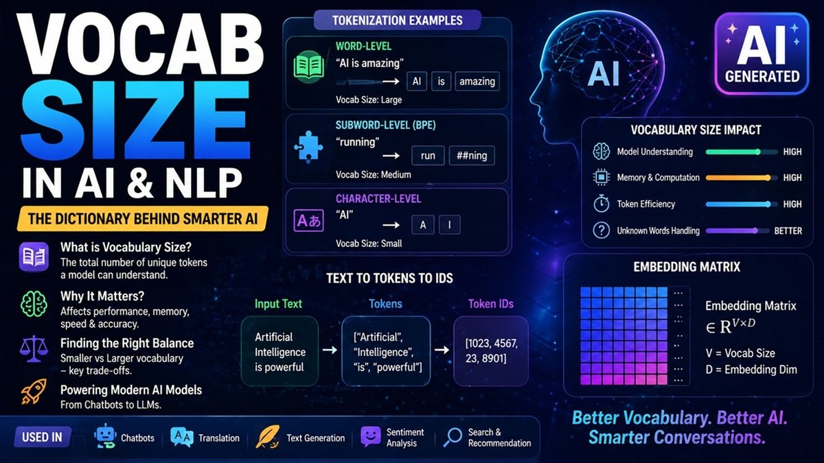 In Artificial Intelligence, especially Natural Language Processing (NLP), vocabulary size (vocab size) is one of the most critical design choices when building models like chatbots, translators, and large language models.